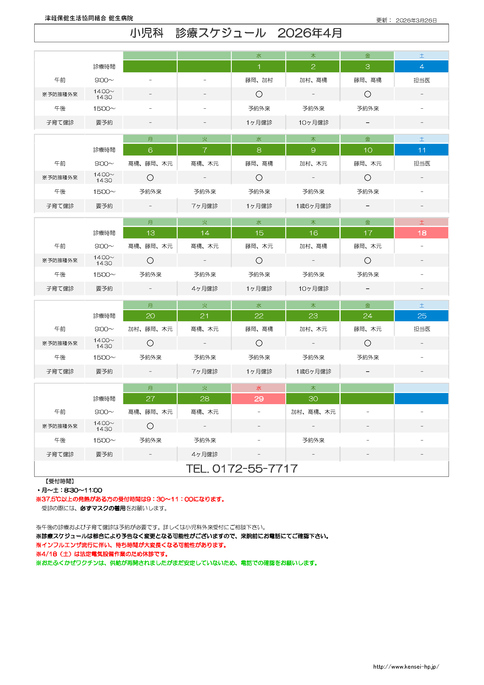 2026年4月の小児科外来診療スケジュールは下記の通りです。 なお、診療スケジュールは都合により予告なく変更となる可能性がございますので、来院前にお電話にてご確認ください。TEL.0172-55-7717