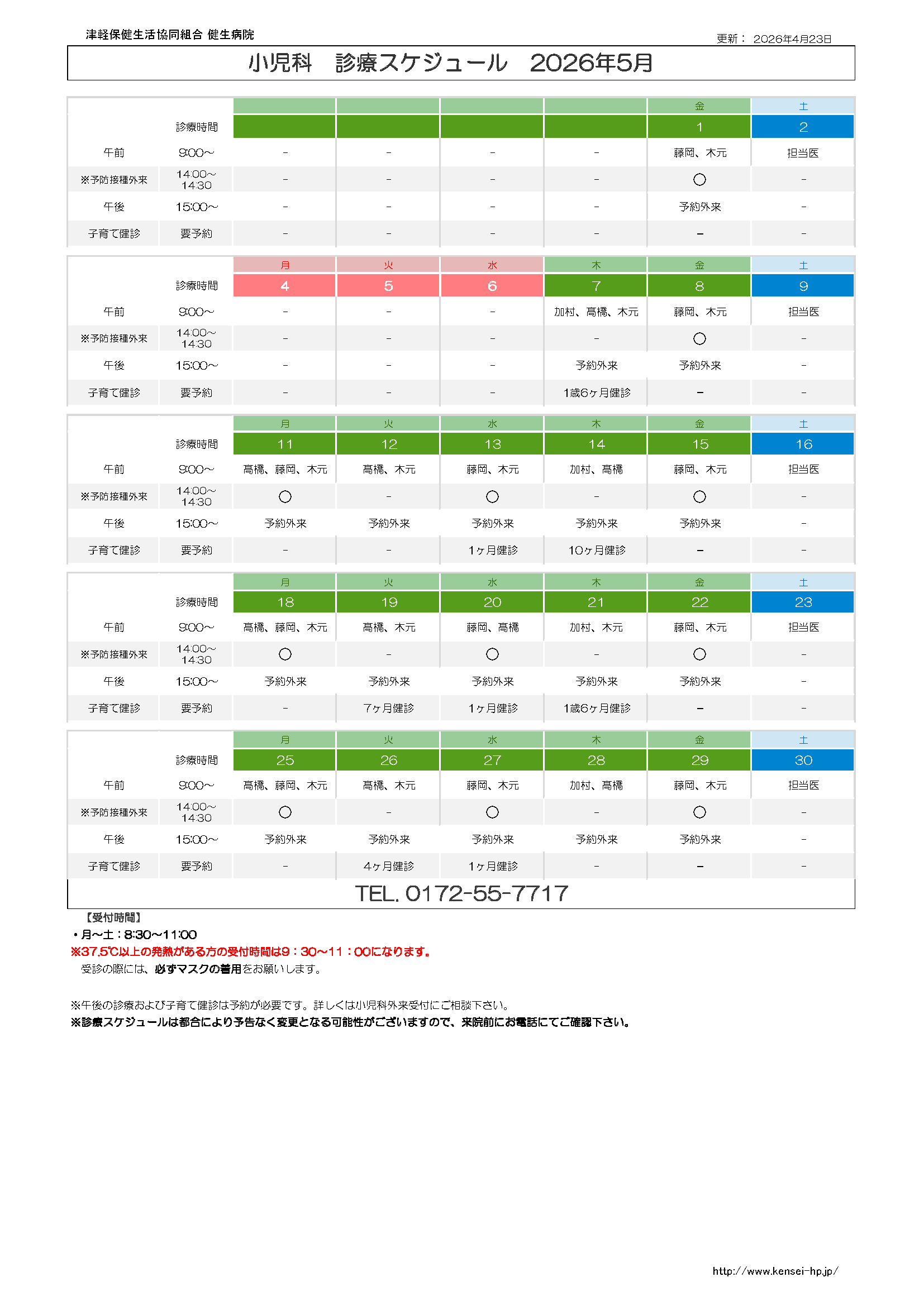 2026年5月の小児科外来診療スケジュールは下記の通りです。 なお、診療スケジュールは都合により予告なく変更となる可能性がございますので、来院前にお電話にてご確認ください。TEL.0172-55-7717
